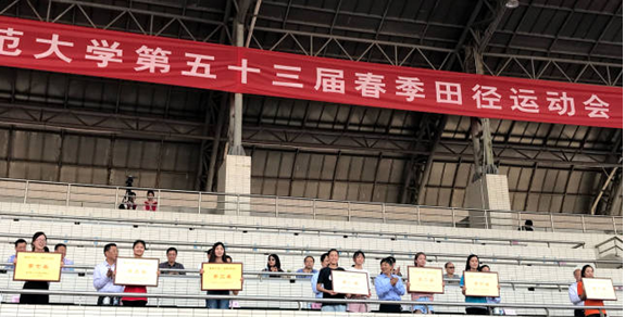 随后,运动会总裁判长宣布了此次运动会的比赛成绩:初等教育学院、继续教育学院并列学生女子组第一,经济与管理学院、继续教育学院并列学生男子组第一,数学科学学院、机关一代表队、外国语学院分别夺得教工组前三名。相比起运动员们的获奖,学院每一个人共同争得的荣誉更令人期待。继续教育学院、马克思主义学院、数学科学学院、计算机与信息科学学院、经济与管理学院、生命科学学院获得了本次运动会的精神文明奖,物理与电子工程学院、体育与健康科学学院获得组织奖。校领导为获奖的单位进行了颁奖。各学院的领奖代表们捧着属于学院的荣耀向全校展示着自己学院的傲人成绩,高举的双手是为学院感到骄傲的体现。最后,伴着校歌,周泽扬校长宣布M88第五十三届春季田径运动会顺利闭幕。