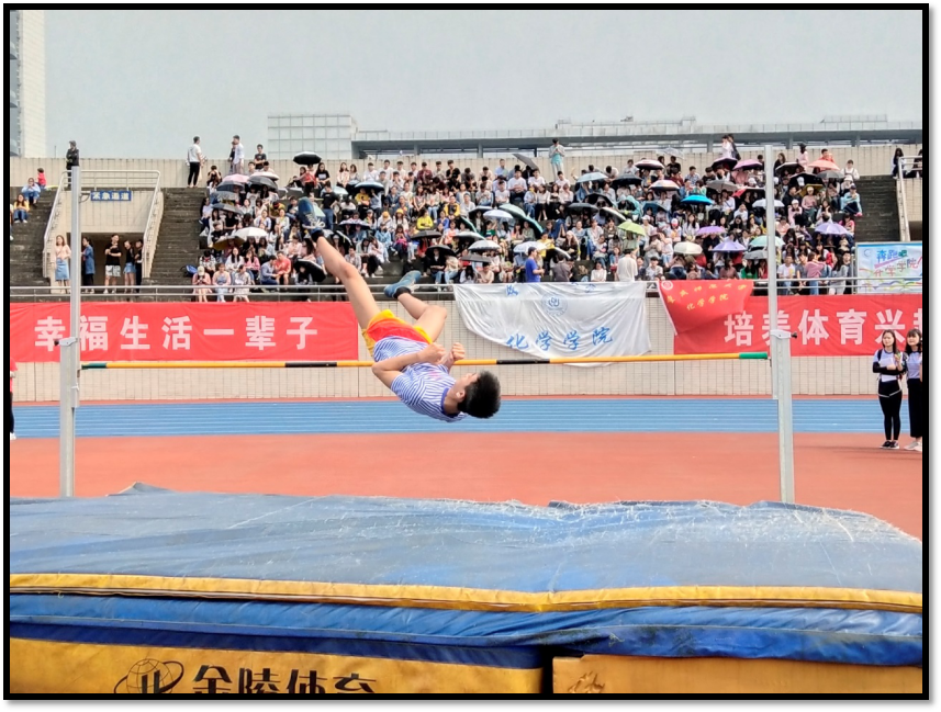 4月27日9时30分,男子组跳高运动员们准备就绪,等着一展风采。首先裁判舞动手中的指示旗,表示比赛正式开始。一个个跳高运动员们,在步伐优美的助跑后,一跃,身体在空中划出一道弧线。而后,迅速沉身,收脚。每一步都显得格外专业。比赛实行淘汰制,每一轮都会有人出局,也会有人从中脱颖而出。其中,来自继续教育学院的两名运动员表现的尤为突出。他们一跳一跃,互相友好的竞争着。全场的焦点聚集在他们身上,场外的观众为他们的呐喊,他们迎来了最后的角逐。剩下来的运动员也寥寥无几,前半场表现得优异的两名运动员最终也被淘汰。此时,冲出重围的运动员是来自经济管理学院的朱同心和数学学院的蒋赏。全场的焦点聚集在他们身上,场外的观众为他们撕心离肺的呐喊,他们迎来了最后的角逐。小红旗再次挥起,两位选手都为自己的荣誉而战。最后,经济管理学院的朱同心荣誉夺冠,全场响起了欢呼。