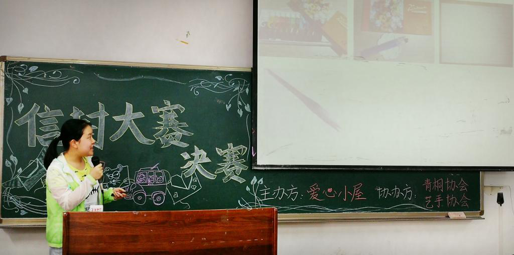 4月19日14时30分,爱心小屋信封设计大赛决赛在弘德楼4302教室举行。参加本次活动的有来自各个学院的学生以及活动相关负责人,评委组由爱心小屋负责人杨柳、陈静等人组成。