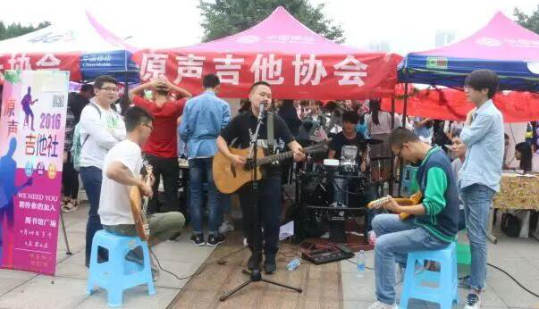 为了吸引新生的目光,纳入更多志同道合的小伙伴,各社团根据自身特点与优势设计了别出心裁的宣传手段,引来同学们的热情围观。社会工作协会穿上皮卡丘玩偶装,身披协会旗帜,穿梭在人群中;原声吉他爱好者协会同邻居吉他协会一起,以音会友,时而轻柔婉转,时而高亢激昂,领音乐环绕整个广场;舞蹈协会在节奏的律动中活力四射,帅气的动作引起无数的尖叫与掌声;历史爱好者协会,穿上古装,各色美女婀娜多姿,古风古韵,成为百团大战中一道亮丽的风景线。各位同学对百团大战热情爆棚,广场人山人海,从高处俯视,全是人头。同学们手拿各大社团宣传单,不停环顾四周,眼里充满好奇。尽管在此之前,许多社团已然开始招新工作,但大一新生们仍然对这次活动充满了期待。在招新现场,可以看到有的同学手中拿着一叠收到的宣传资料,有的同学在认真地听学长学姐讲解社团的活动,有的已经通过面试成为会员的大一新生也加入了宣传自己社团的队伍。整个广场被挤得水泄不通,人声鼎沸中洋溢着新生的热情。其中,吉他社、舞蹈社等兴趣型社团表演场地里三成外三层都是人。据小编采访,同学们加入社团大多以兴趣爱好为主,其中不乏有同学想到社团学习技能开阔视野的。他们大多对社团满怀期待,希望能一展拳脚。