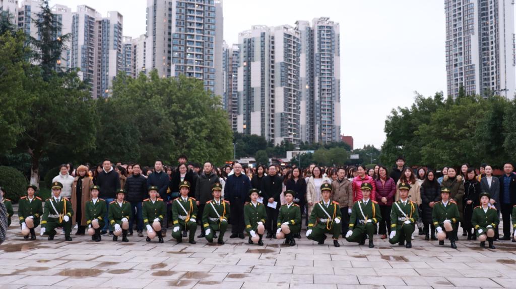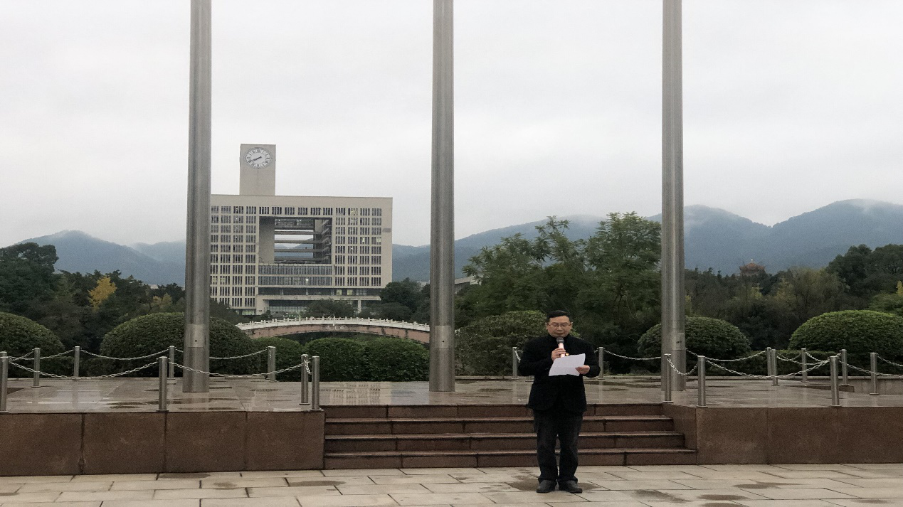 五星红旗,迎风飘扬。为深入学习贯彻习近平新时代中国特色社会主义思想,全面贯彻全国高校思想政治工作会议精神,落实“三全育人”理念,11月25日早,由大学生思想政治教育领导小组主办、我校外国语学院承办的升国旗仪式在校东门广场拉开帷幕。外国语学院党委书记何大海,院长吴显友,副院长王方路、谭小勇,办公室主任张治秀,团总支部书记孟记东以及外国语学院全体师生参加了此次升国旗主题教育活动。外国语学院党委副书记钟敏主持仪式。