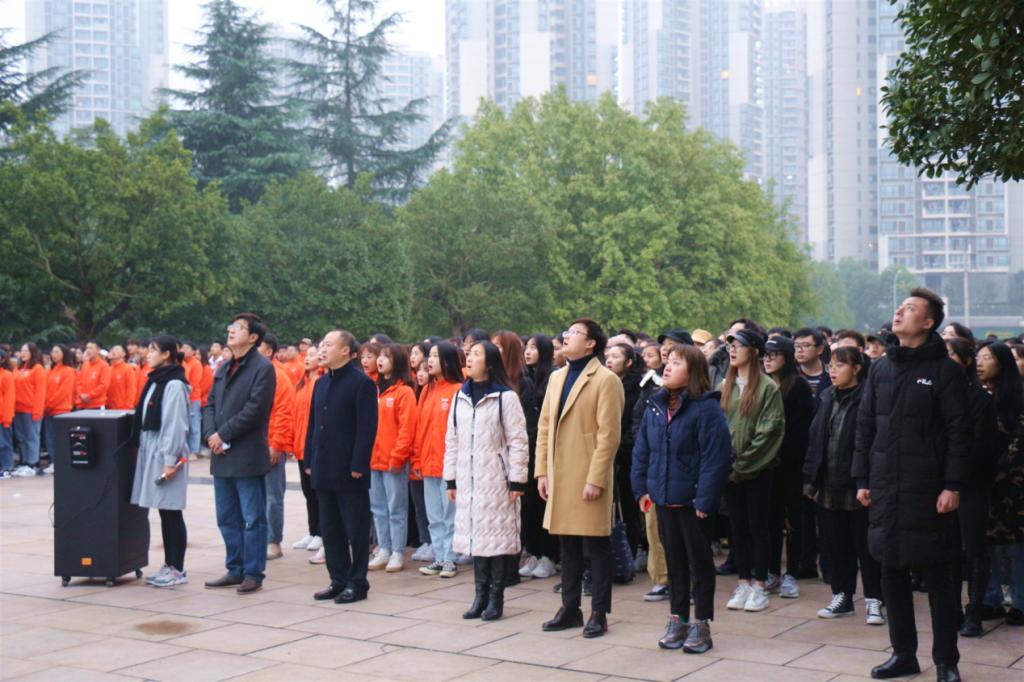 7:45分,升旗仪式正式开始。迎着冬日的晨光,国旗护卫队迈着铿锵有力的步伐护送国旗入场。当鲜艳的五星红旗冉冉升起,音乐学院全体师生庄严肃立,放声高唱《义勇军进行曲》,向国旗行注目礼。
