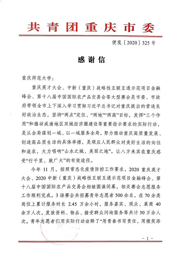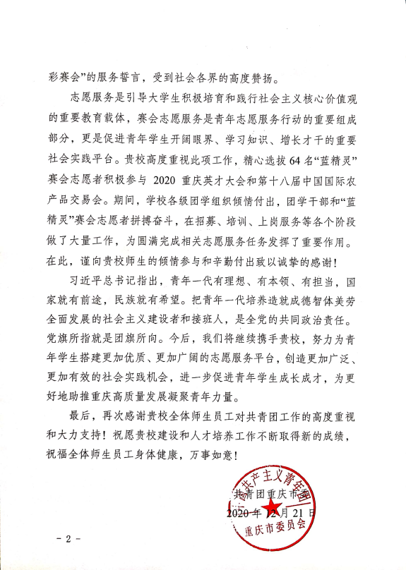 2020年12月21日,共青团市委向我校发来感谢信,向我校师生在2020重庆英才大会和第十八届中国国际农产品交易会的倾情参与和辛勤付出致以诚挚的感谢。