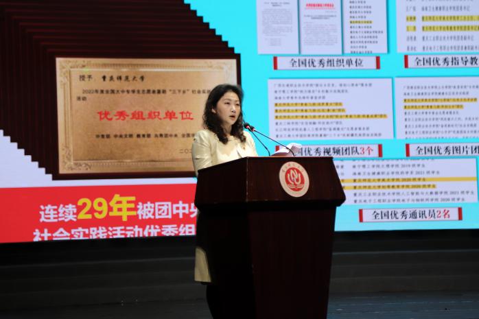 校团委书记高菁励从“实起来”“亮起来”“强起来”三个层面对本次暑期“三下乡”社会实践活动作总结汇报。相关职能部门负责人依次对先进集体和先进个人代表进行颁奖。