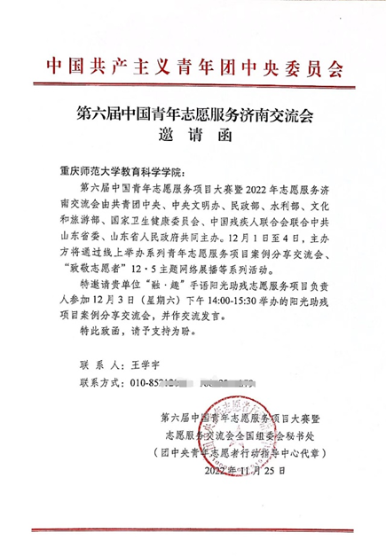 近日,由共青团中央、中央文明办、民政部、水利部、文化和旅游部、国家卫生健康委员会、中国残疾人联合会联合中共山东省委、山东省人民政府共同举办的第六届中国青年志愿服务项目大赛暨2022年志愿服务交流会全国赛终评于11月12日至13日在北京和山东济南落下帷幕。在此次比赛中,我校教育科学学院“融•趣”手语阳光助残志愿服务项目成功斩获中国青年志愿服务项目大赛国家级铜奖,并于12月3日受邀参加了第六届中国青年志愿服务交流会阳光助残专场进行志愿服务案例分享交流。