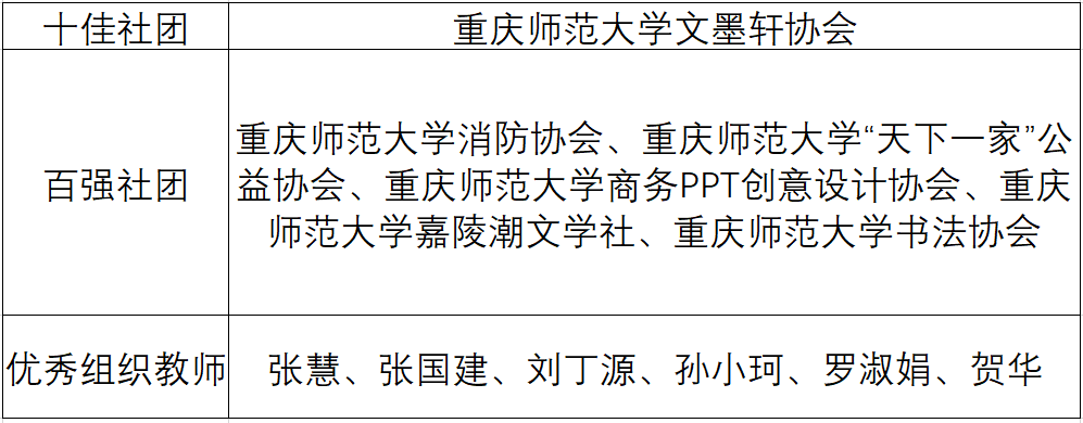 据悉本次活动根据各学校组织参与情况,遴选出24个优秀组织单位、10个“大学生社团文化风采展示活动十佳社团”、100个“大学生社团文化风采展示活动百强社团”和106名优秀指导教师。M88文墨轩协会入选十佳社团,M88消防协会、M88“天下一家”公益协会、M88商务PPT创意设计协会、M88嘉陵潮文学社、M88书法协会被列入百强社团名单,张慧、张国建刘丁源孙小珂罗淑娟、贺华共六位教师被评为优秀组织教师。此次活动不仅展示了各位社团成员的青春活力,也彰显了重师学子昂扬向上的精神学习风貌