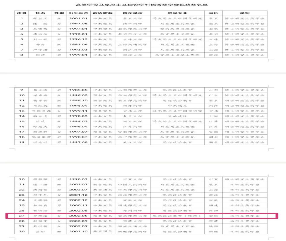 喜报|重庆唯一!热烈祝贺马院学子罗茂渝荣获第二届高等学校 马克思主义理论学科优秀奖学金