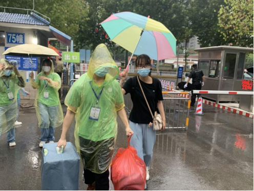 (图为志愿者冒雨为新生搬运行李)