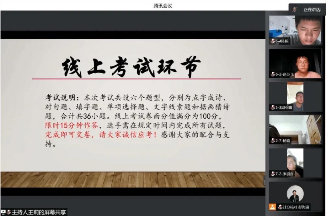 首先进行的是“线上考试”环节。此环节选手们需要完成限时15分钟的线上作答。为保证比赛的公平性,所有选手需开启摄像头,工作人员随机进行巡查。