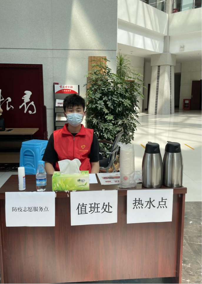 2022年4月,音乐学院2021级的花正东同学在学校国风楼和校友会堂执勤,对来往医护人员进行登记。他说道:“疫情期间,很荣幸能够作为志愿者辅助医护人员的用餐需求和配送物资,为本次疫情贡献自己的一份力量。通过志愿服务活动,我深刻领悟到做志愿者不仅能够获得很多实践经验,还能磨炼自己的意志品质。在今后的岁月中,我将更加坚定自己的信念,发挥自身优势,服务社会、传递爱心、传播文明,为社会的和谐发展贡献自己的力量。”