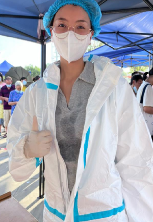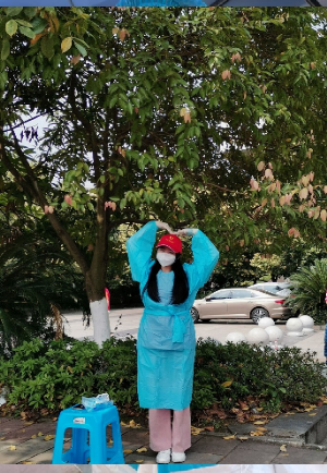 2022年3月,音乐学院2021级的赵芯跃同学积极响应防疫号召,坚守在自己的岗位上,负责布置现场、搬运物资、录入信息核酸采集。她说“在场的志愿者都穿着防护服站在烈日下。医护人员更是穿着加厚的防护服,很是辛苦。长时间的工作并没有打倒我们,而是让我们更加坚定了战胜疫情的决心。我相信在大家的共同努力下,疫情很快就会过去。”