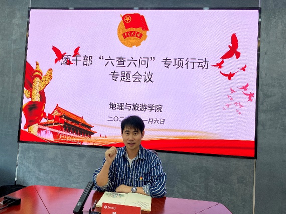 为认真落实共青团中央《新时代全面从严治团实施纲要》、《全面从严治团工作方案》精神,从严抓好团干部队伍作风建设,2022年11月6日,地理与旅游学院召开团干部“六查六问”专项行动专题会议,院学生会全体干部骨干参会,会议由学院团委书记兼学工办主任瞿聪主持。