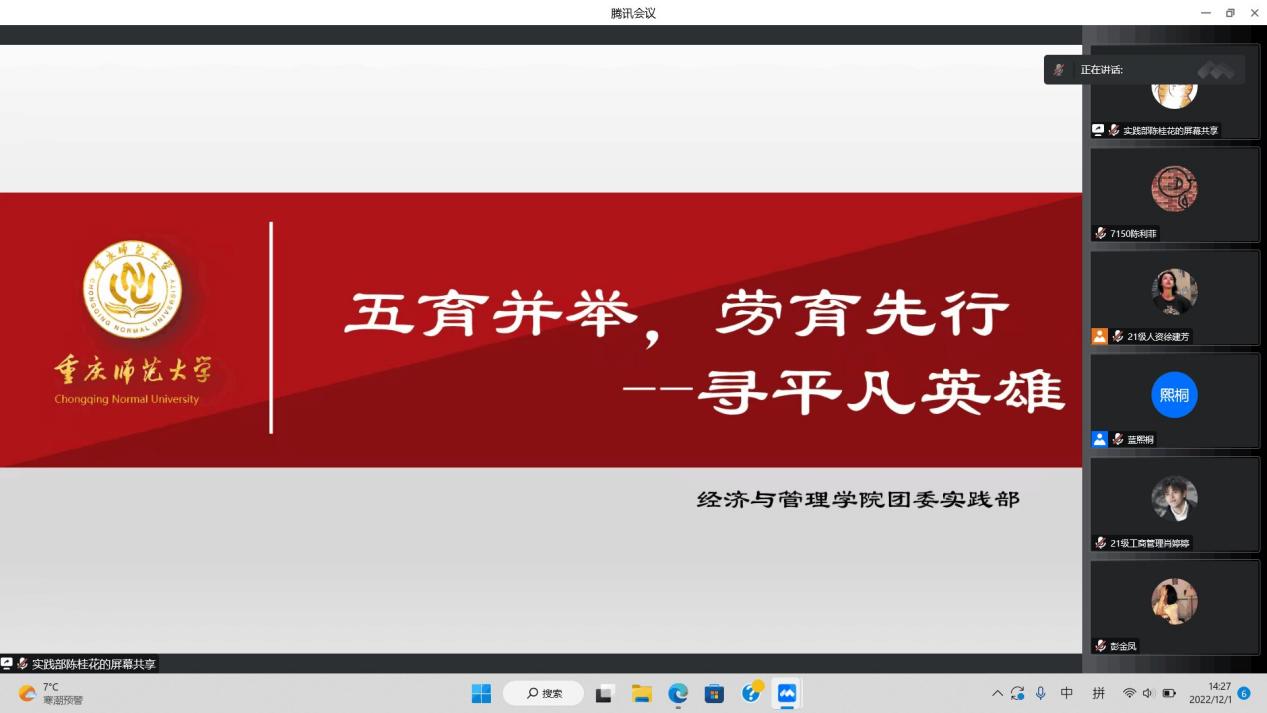 为深入贯彻习近平总书记对于青年“德智体美劳”全面发展的要求,落实学校对同学们进行劳育的号召,121日,经济与管理学院以线上形式开展“五育并举,劳育先行”主题宣讲会,由经济与管理学院团委学生会实践部主要负责人陈桂花宣讲。