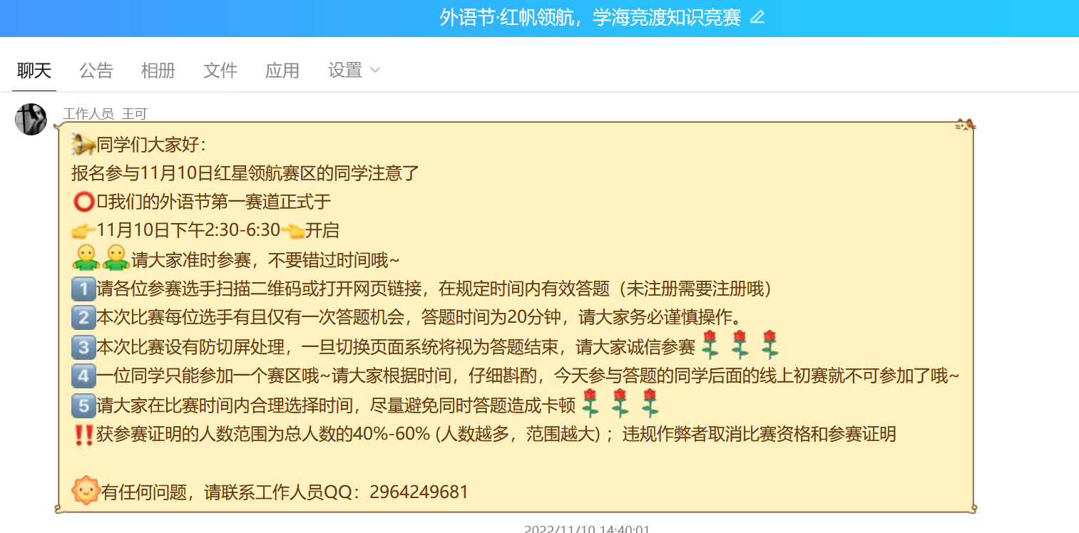 初赛设置了三个赛道,分别为红色党史赛道、欧美文化赛道和中华文化赛道。比赛全程在赛事星app中完成,所有参赛选手择一赛道参赛,工作人员发出参赛链接,参赛选手在规定时间内作答即有参赛记录。1110日第一赛道比赛于14:30-18:00进行,参与人数346人。同学们展现出高度的参赛热情,对于平台操作中出现的问题相互解答。比赛结束后当天晚上工作人员公布参赛记录。第二赛道比赛于111714:30-21:30进行,参赛人数165人。第三赛道比赛于111814:30-21:30进行,参赛人数161人。最后,工作人员公布了比赛结果,发布了参赛证明,至此 “外语节·红帆领航,学海竞渡知识竞赛”初赛结束。