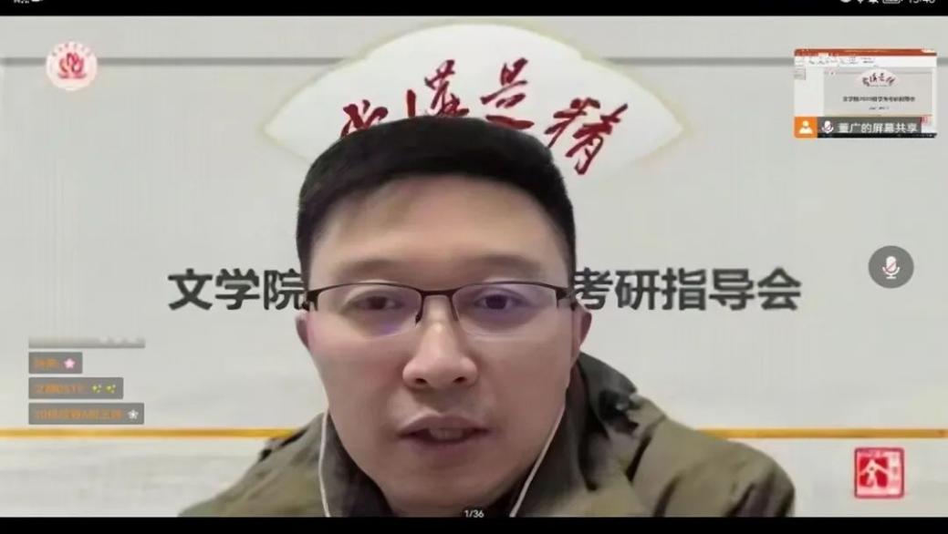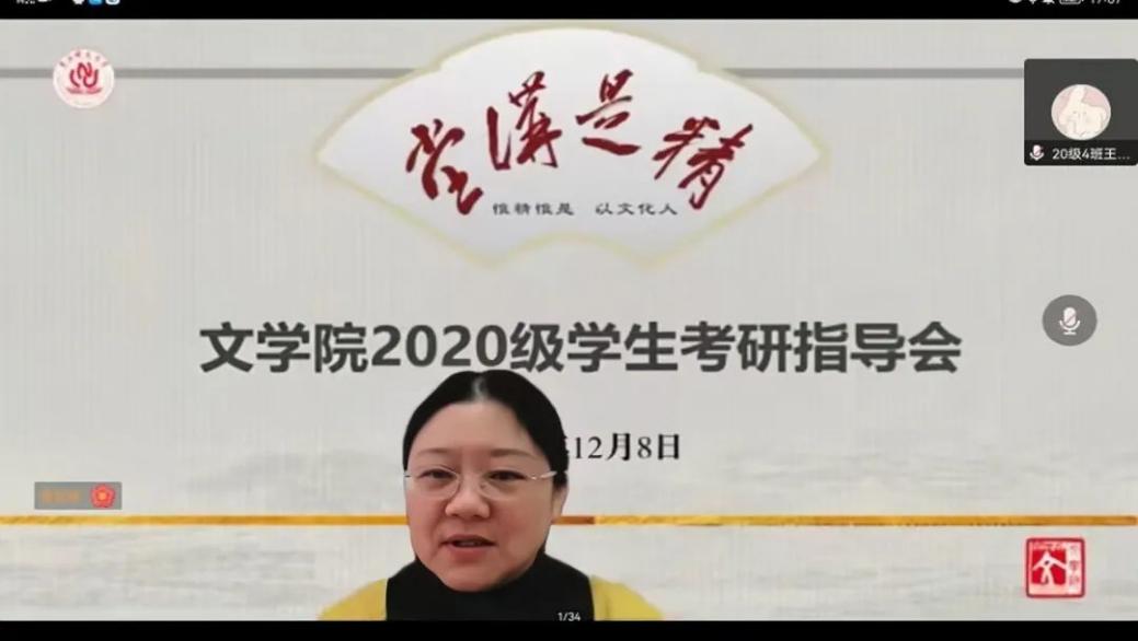 为帮助本科生明确考研目标,了解中国语言文学一级学科、学科教学(语文)和汉语国际教育专硕相关信息,尤其是文学院 “英才计划”开展情况,128日下午,文学院举办了2020级学生考研线上指导会。出席会议的有文学院党委书记税强,副院长凌孟华、何易展,党委副书记杨梅,会议由文学院辅导员董广主持。