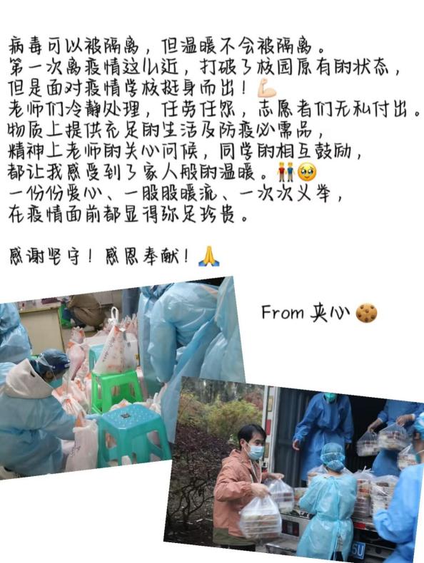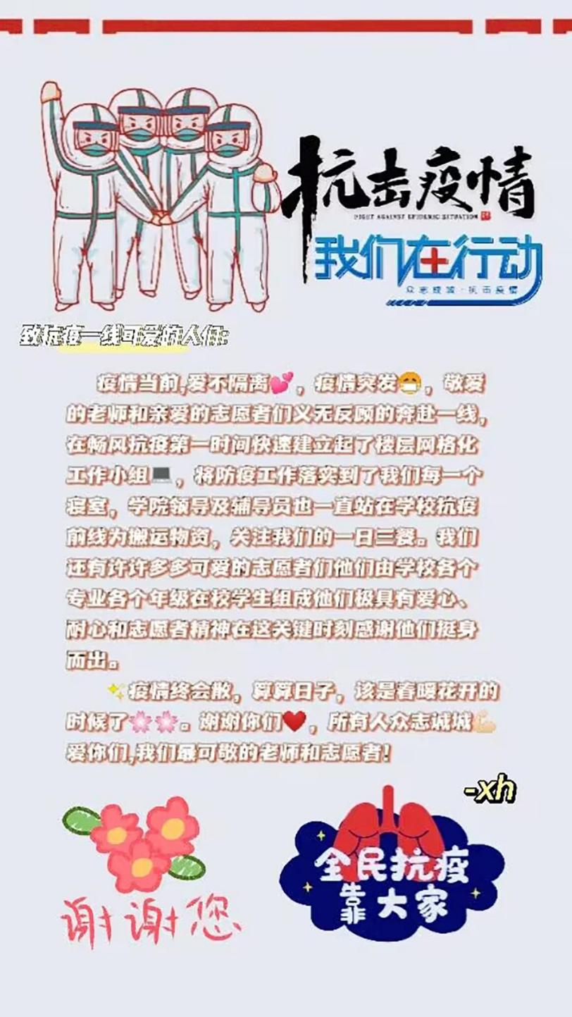病毒无情,人间有爱;勇毅前行,战无不胜。随着学院疫情形势得到控制,逐渐明朗,同学们为向亲爱的老师和志愿者们表示最真挚的感谢,写下了自己想对亲爱的他们说的一些话: