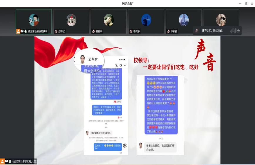 在本次课堂中,辅导员们分别从时间与场景、角色与立场、声音和色彩三个方面讲述了在封寝的这段时间里,校院领导、教师、辅导员、学生会干部、志愿者以及医护人员们的默默付出与努力。学校领导宏观调控、事无巨细;学院师生亲力亲为、落细落实;医务人员们任劳任怨、无私奉献;志愿者们尽心尽力、默默无闻……同学们看在眼里,记在心中,满屏的“你们辛苦了”表达了同学们心中无限的感激之情。
