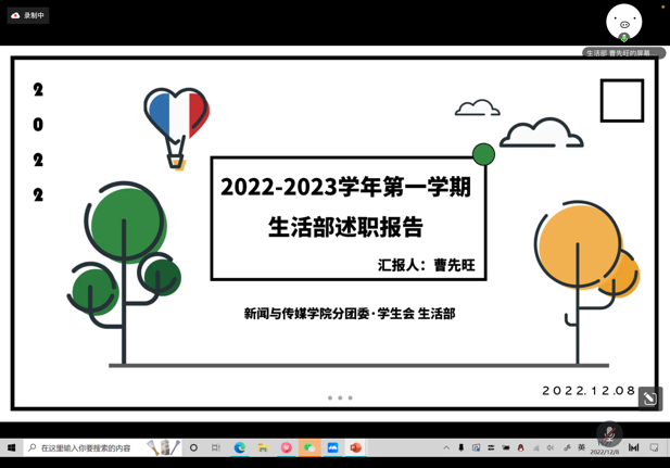 12月8日下午14时30分,我院以线上形式举办了2022-2023学年度第一学期述职评议会。院党委书记郑志坚、院党委副书记赵艳君、院党委组织员何东、分团委书记曾珠、辅导员李畅、熊风、蔡晖老师以及学生代表参会。会议由学生副书记邓燕主持,分团委·学生会主席团及各部门主要负责人依次对本学期工作进行述职。