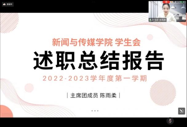 会议伊始,由主席团成员陈雨柔、柴炜、任雨晴,学生副书记邓燕、李宗忆分别对自己本学期工作进行概括和反思,其中陈雨柔同学表示希望未来学院举办更多富有新传特色的活动,并发出“你我常相随,新传学生会”的口号。