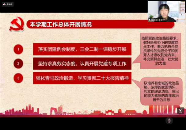 组织部主要负责人窦金宇围绕团建、党建和青马班三个工作板块进行了总结并展望了未来工作。