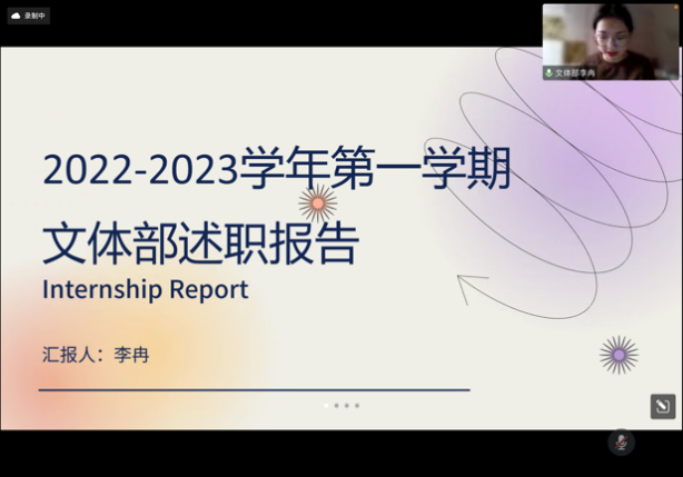 文体部主要负责人李冉对本学期所举办的篮球赛和运动健康打卡活动进行了介绍和反思,并阐述了部门的未来规划。