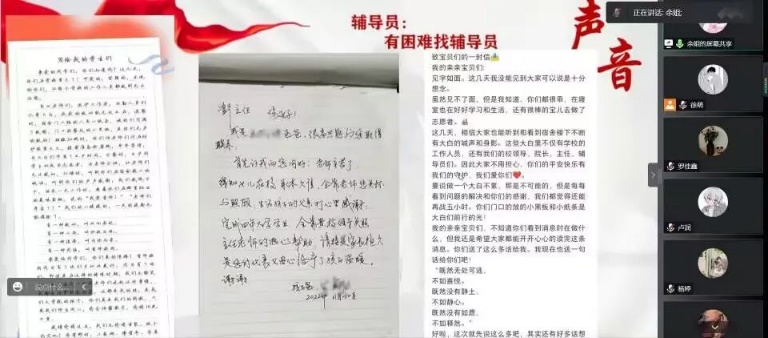 学院领导齐上阵,辅导员们24小时在线,及时回应学生和家长关切……同时,每位同学也都以自己的实际行动表达感恩之情。越来越多的学生自告奋勇参与到志愿者工作中,主动减轻工作人员们的负担。此外,同学们用小黑板绘制图文、撰写书法作品等方式表达对“大白”的感谢之情,同学们还发起了“共克时艰、疫不为惧”云端朗诵会,提振抗疫的信心和决心。当得知女儿在校身体欠佳,全靠辅导员彭臻关心和照顾时,家长还写信向学校领导和辅导员表示感谢!