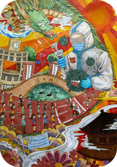 在这样的时刻,我们应该思考些什么?我们又该做些什么?科学精准的抗疫策略与措施当然重要,同时,积极健康、昂扬向上的精神状态更加不可或缺。在老师指导下,美术学院2021级的同学们在学习《装饰设计基础》课程的过程中,纷纷拿起手中的画笔,聚焦“抗疫”主题,讲述抗疫故事,宣传抗疫知识,赞美抗疫英雄,传递人间真情,展现了蓬蓬勃勃的青春朝气、有“艺”无“疫”的无畏姿态,也用形象化的视觉语言诠释着“生命至上、举国同心、舍生忘死、尊重科学、命运与共”的伟大抗疫精神。这样的创作与交流,不仅可以丰富校园文化生活、营造浓厚艺术氛围,反映了美院学子良好的精神风貌,也极大地缓解了同学们因疫情严峻和临时管控而产生的紧张情绪、心理压力,诠释了艺术所蕴含的强大力量。