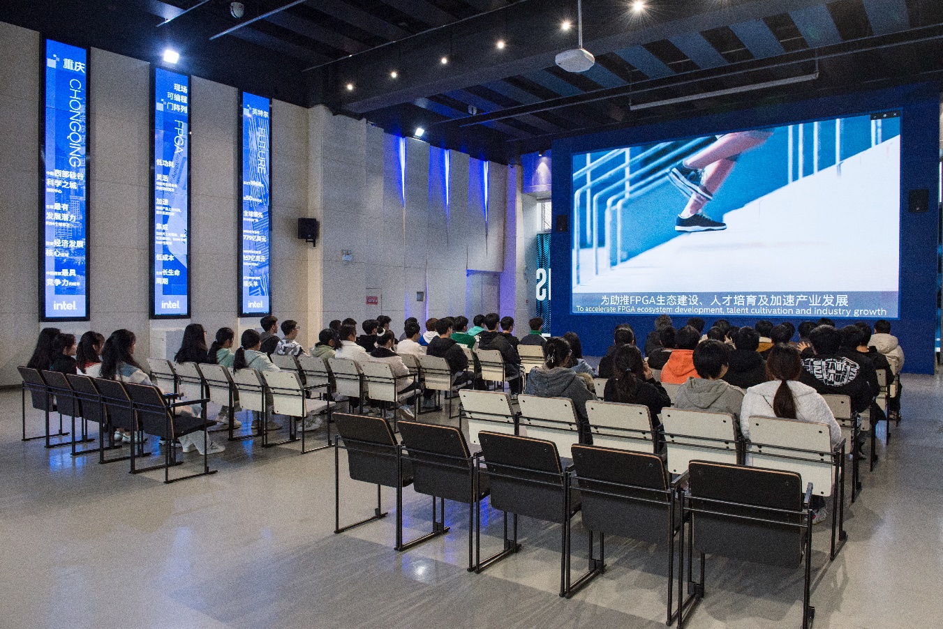在企业负责人的带领下,2022级电子信息专业的同学们观看了FPGA(现场可编程门阵列)的相关发展视频,并从中了解到FPGA全新的芯片布局、新一代HyperFlex寄存器架构、多样的时序优化方法、英特尔10纳米SuperFin工艺、系统级3D芯片以及更灵活的DSP和布线微架构。