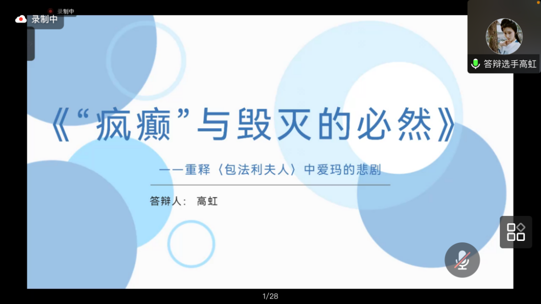 第二位选手高虹同学的论文题目是《“疯癫”与毁灭的必然——重释<包法利夫人>中爱玛的悲剧》。高虹同学通过结合父权制诗学原则和资本发展进程,对《包法利夫人》的文本内容进行深入诠释,以独特视角带领同学们认识作家福楼拜笔下的角色。严金东老师在点评时肯定了选手对于文本内容的深度解读,并对其论文中结合时代背景与文学传统对角色进行分析表示认可。