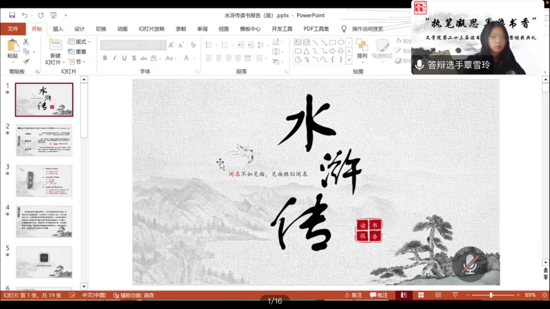 第三位选手覃雪玲同学以《基于名著再经典化探究的整本书阅读指导——以<水浒传>为例》为题,从教学方面对名著阅读进行剖析和探究。薛晓嫘老师在点评中赞赏其新颖的论文选题,并重点指出整本书阅读是指导中小学学生阅读的教学关键。