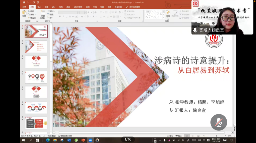 第一位选手鞠良宜同学以《涉病诗的诗意提升:从白居易到苏轼》为选题,从研究背景与方法、论文具体内容、研究意义与创新之处、文献来源四个方面展开对涉病诗的探究与讲解。点评环节,陈良中老师与凌孟华老师先后肯定了论文的整体内容和选手的表达能力,并针对本篇论文中出现的不足之处提出修改意见。