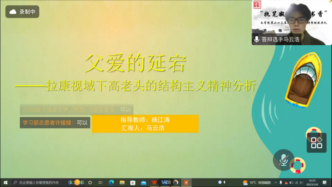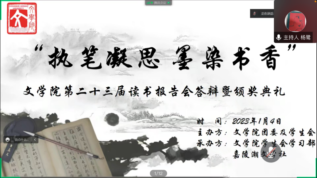 旧书不厌百回读,熟读精思子自知。为提升文学院学生精读、细读书籍的能力,营造良好的学术科研氛围,文学院于1月4日14时30分线上举办了第二十三届“执笔凝思,墨染书香”读书报告会论文答辩暨颁奖典礼。文学院副院长凌孟华老师、古代文学教研室陈良中老师、文艺学教研室严金东老师和教学法教研室薛晓嫘老师参加本次报告会,各年级学生同步线上观摩学习。