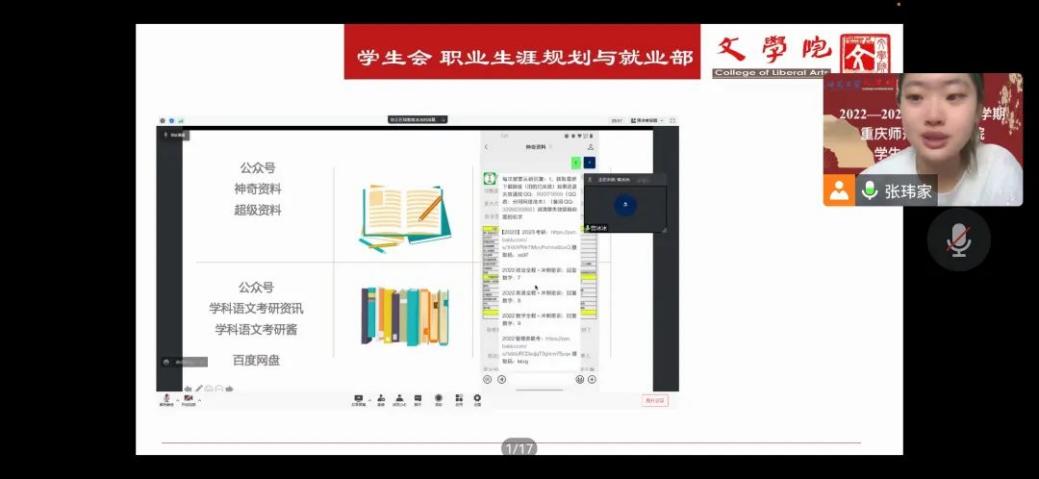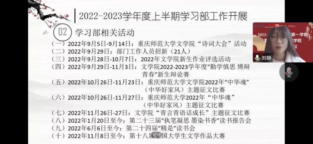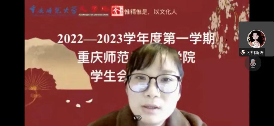 为深入贯彻党的二十大精神,加强学生骨干队伍建设,促进学生会各部门之间的合作交流,文学院于12月28日13时线上召开了2022-2023学年第一学期学生会述职评议工作会。文学院团委书记康慧老师、学生会主席团成员、各部门主要负责人以及各班团学生代表参与本次会议。