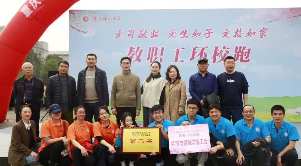 在此次环校跑活动中,经济与管理学院汪翔、马青、唐艺珊、范波、张在一、古广东、涂先进、刘靖羽、丁延昭、王崇明等十位教师代表经济与管理学院荣获了全校团体第二名的优异成绩!赛后校党委副书记、校长孟东方等校领导对全体教职工致辞,表达了学校对女教师们的真切祝愿。经济与管理院党委书记钟敏,院长郑景丽等院领导与学院参赛老师们温情合影,表现出了经管院领导对本院教师们的爱护与深切期盼,也烘托出了经管学院亲如一家的氛围,温暖了经管学子们的心,更鼓舞着经管人们奋勇向前!