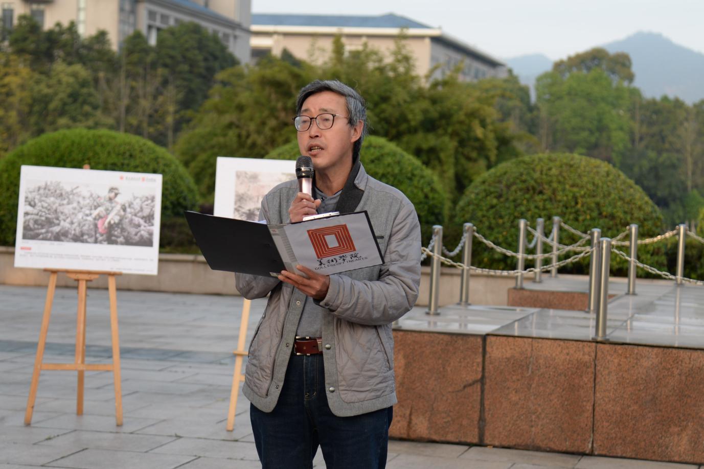 美术学院党委书记刘清泉以“不变的红,永恒的爱”为题做国旗下的讲话。他首先向大家介绍了现场摆放的展览,是《美术经典中的百年党史》中的部分经典作品,是我们党走过百年的光辉缩影,是绵延不绝的精神谱系,也是我们应该铭记于心的一个个精彩瞬间。他指出,红,是艺术的原色,更是中华民族生生不息的源动力。勉励老师们、同学们,不止于在政治思想、道德操守上要守住自己的初心,更要在艺术创作、艺术设计、艺术教育等等,也应拥有“一颗红心”。他强调,爱国是一种情怀,也是一种能力,对于我们美院人来说,爱国更是一门艺术。希望老师们都能立足三尺讲台,躬耕学术科研,切实加强师德修养、树立良好师风,爱生如子,在培养人造就人的光荣事业中实现自己的人生价值;希望同学们都能勤学善思、求是致用,悟有所得、做有所成,尊师敬长、从善如流,不负青春韶华,放飞青春梦想,以爱国之心拥抱新时代,以报国之行绘制新画卷。