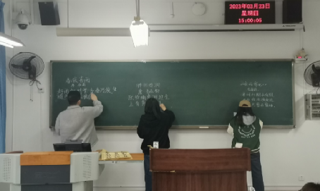 本次活动,参与人员以四人队伍的形式参赛,其中成员分别负责毛笔、硬笔、粉笔、普通话四项中的一项四项比赛分别在弘德楼的四个教室同时进行。活动中,写字的同学屏息凝神,朗诵的同学激情澎湃,现场气氛紧张激烈。一直到16:00 比赛结束,工作人员整合评委评分,得出优胜团队。