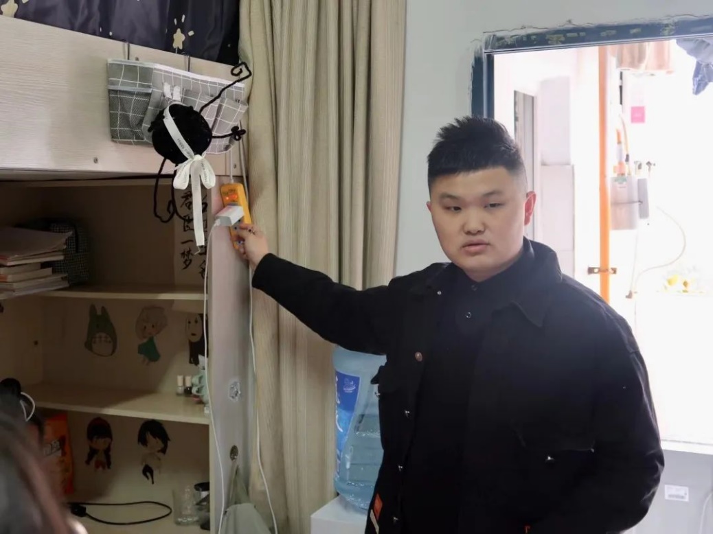 在参观寝室设计之外,老师们对寝室内的安全隐患也格外关注,再三强调同学们要注意用电用火安全,将事故扼杀在摇篮,共建安全寝室。