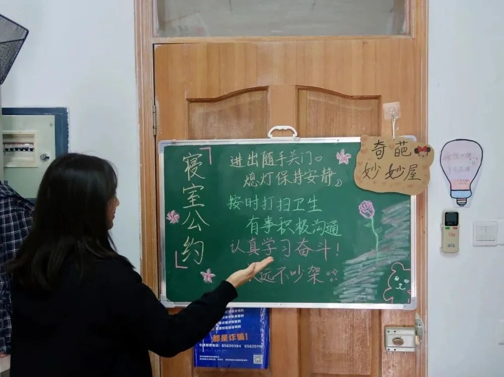 参观过程中,“比奇堡”“德馨斋”“疯狂动物园”等各具特色的寝室名称给人留下深刻印象;“学海无涯,寝室为家”“斯是陋室,惟吾德馨”等趣味标语彰显寝室特色;走进寝室,光洁的地板、干净整洁的书桌让人眼前一亮;挂在门后的寝室公约、寝室作息表等都是同学们对自己大学生活的美好期待……这些无一不体现出同学们的用心与重视。