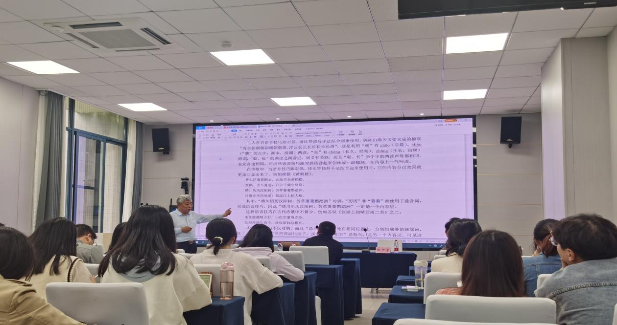 讲座尾声,孙教授对本次讲座进行了回顾和总结:诗歌中存在许多形式标志,找出并分析这些形式标志,能帮助我们正确地进行内容分层。如果能将这些形式标志跟诗文的内容分层结合起来,用于诗文教学,能够帮助学生从形式入手理解诗文的内容分层。同时,正确解读诗文,符合从形式到内容的认知习惯,可以增加学生阅读诗文的兴趣,提高理解能力,这比纯粹从难以捉摸的“意会”入手让学生理解诗文的内容分层效果要好得多。