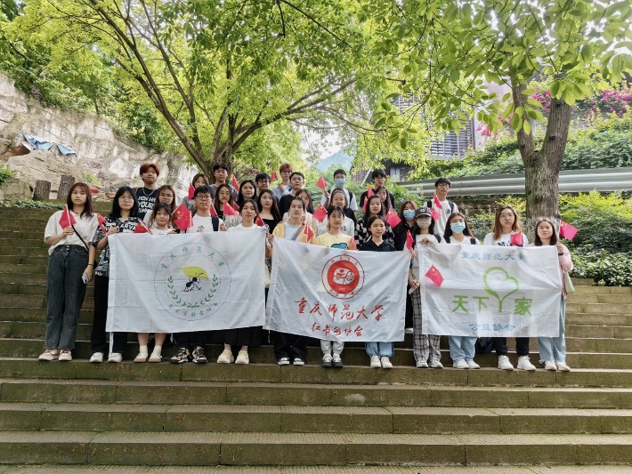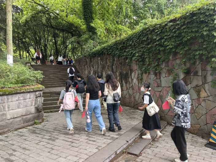 5月7日上午8:00,团队成员在校门口集合,乘坐轻轨前往歌乐山白公馆,中途经过烈士陵园,对革命烈士表达了缅怀之情。