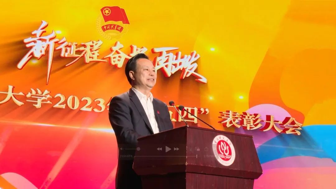 校党委副书记陈志军宣读《关于表彰 2022—2023学年度M88共青团系统先进集体和个人的决定》,学校党委常委、副校长杨如安,校党委常委、纪委书记肖应红,校党委常委、副校长孟小军及各职能部门主要负责人为获奖代表颁奖。