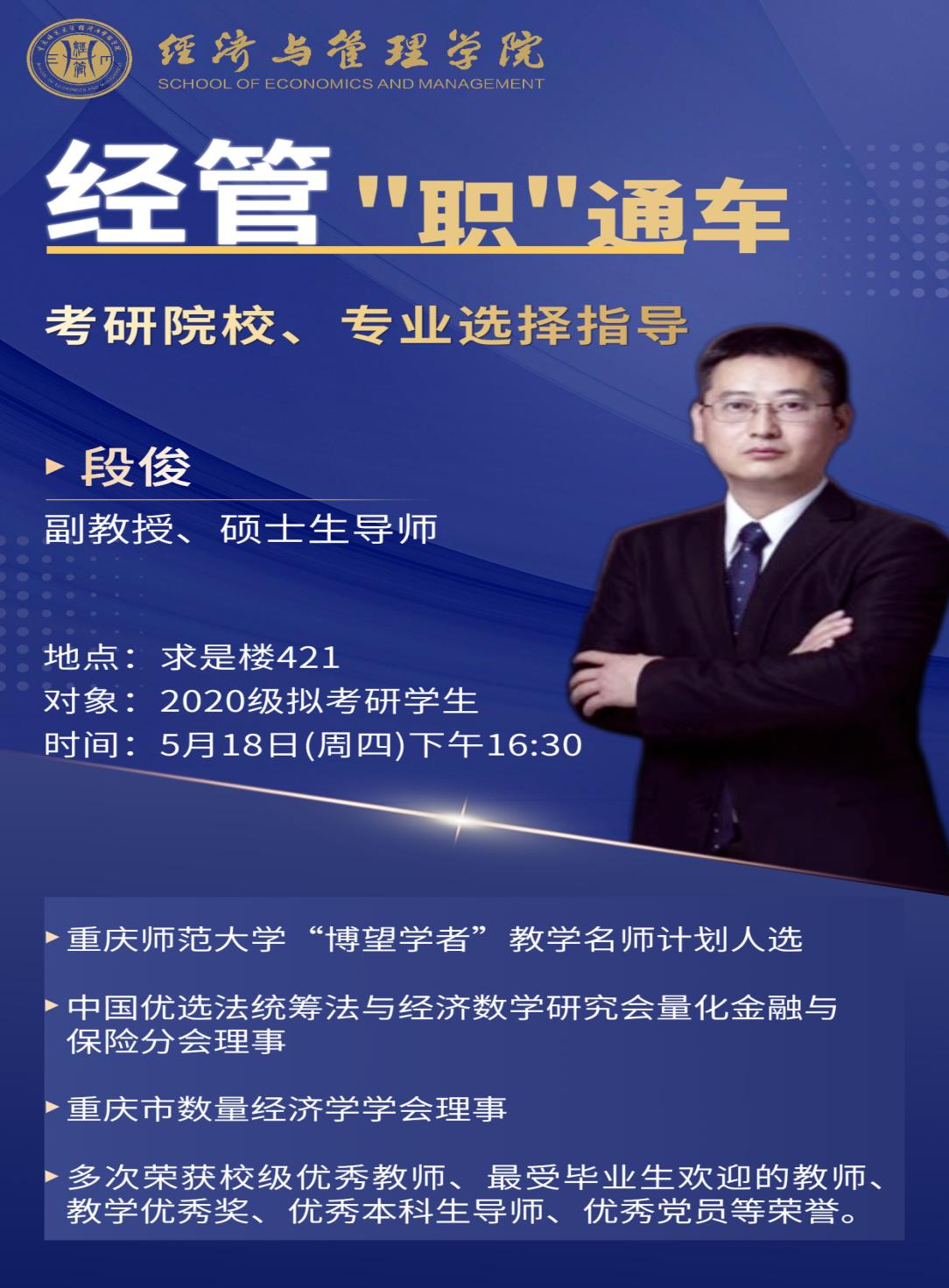 路漫漫其修远兮,吾将上下而求索。为让学生进一步明确考研目标,了解更多考研信息,2023年5月18日下午,经济与管理学院在求是楼421举办考研形势分析和院校、专业选择培训会,硕士生导师段俊以及学工办主任张莉出席本次培训会主讲人,2020级全体拟考研同学积极参与。