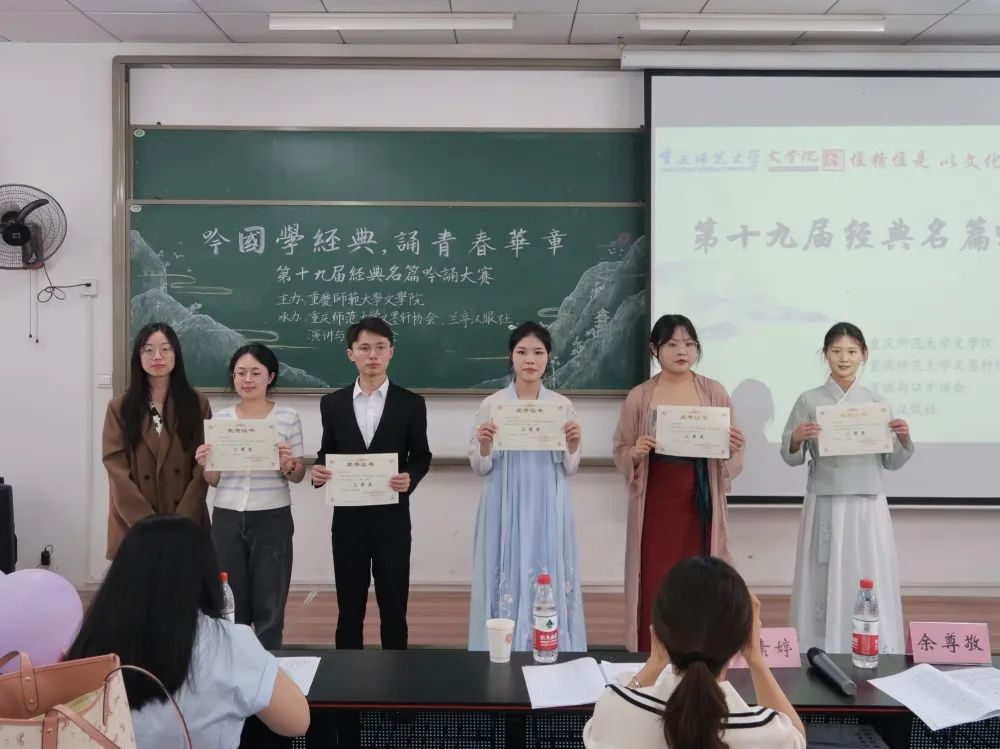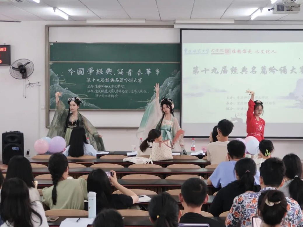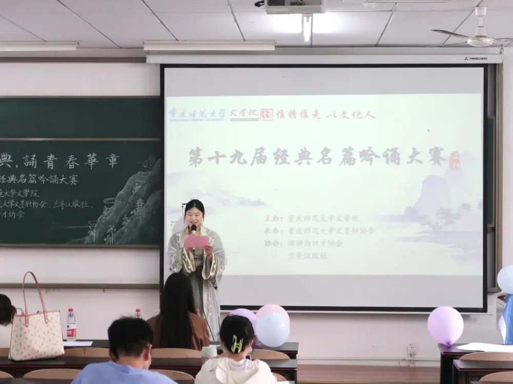 为传承中华优秀传统文化,坚定文化自信,激发学生读经典、诵经典的热情,丰富学生校园文化生活,文学院于5月18日14时30分在砺志楼2309教室开展了“吟国学经典,诵青春华章”第十九届经典名篇吟诵大赛决赛。文学院专任教师杨照、何素婷,专职辅导员余尊敬受邀出席,本次比赛由文学院文墨轩协会承办,兰亭汉服社、木铎国学社协办。