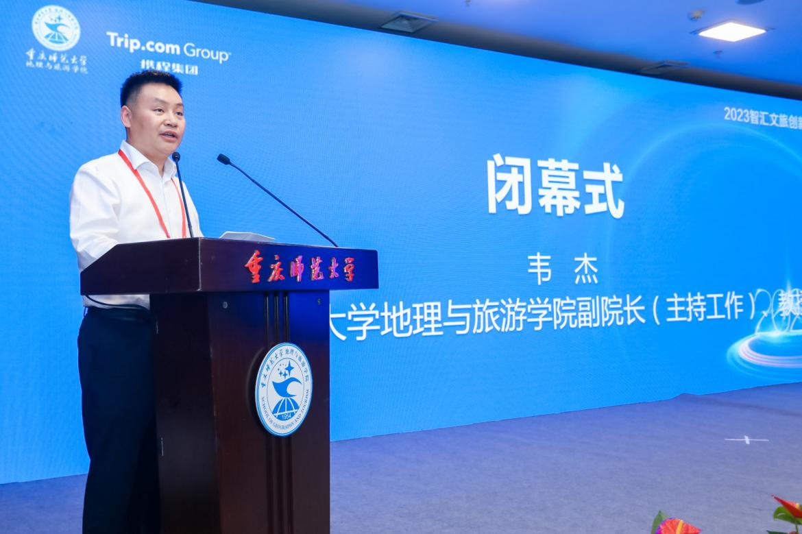 闭幕式环节由M88地理与旅游学院副院长(主持工作)韦杰教授致辞,首先向支持、关心和帮助本次论坛顺利举办的领导、嘉宾和代表表示衷心感谢!他认为此次论坛的召开是M88地理与旅游学院(重庆旅游学院、现代智慧旅游产业学院)在推进旅游学术研究高地建设、加快智慧旅游人才培养与搭建智慧旅游发展智库方面的进一步探索,也是M88与携程集团产学研合作的进一步深化。未来将继续聚焦“智领文旅·汇启未来”,整合多方资源,力争将智汇文旅创新发展论坛打造为重庆智慧文旅行业的标志性学术论坛,以期推动重庆智慧文旅科学研究与人才培养高质量发展!