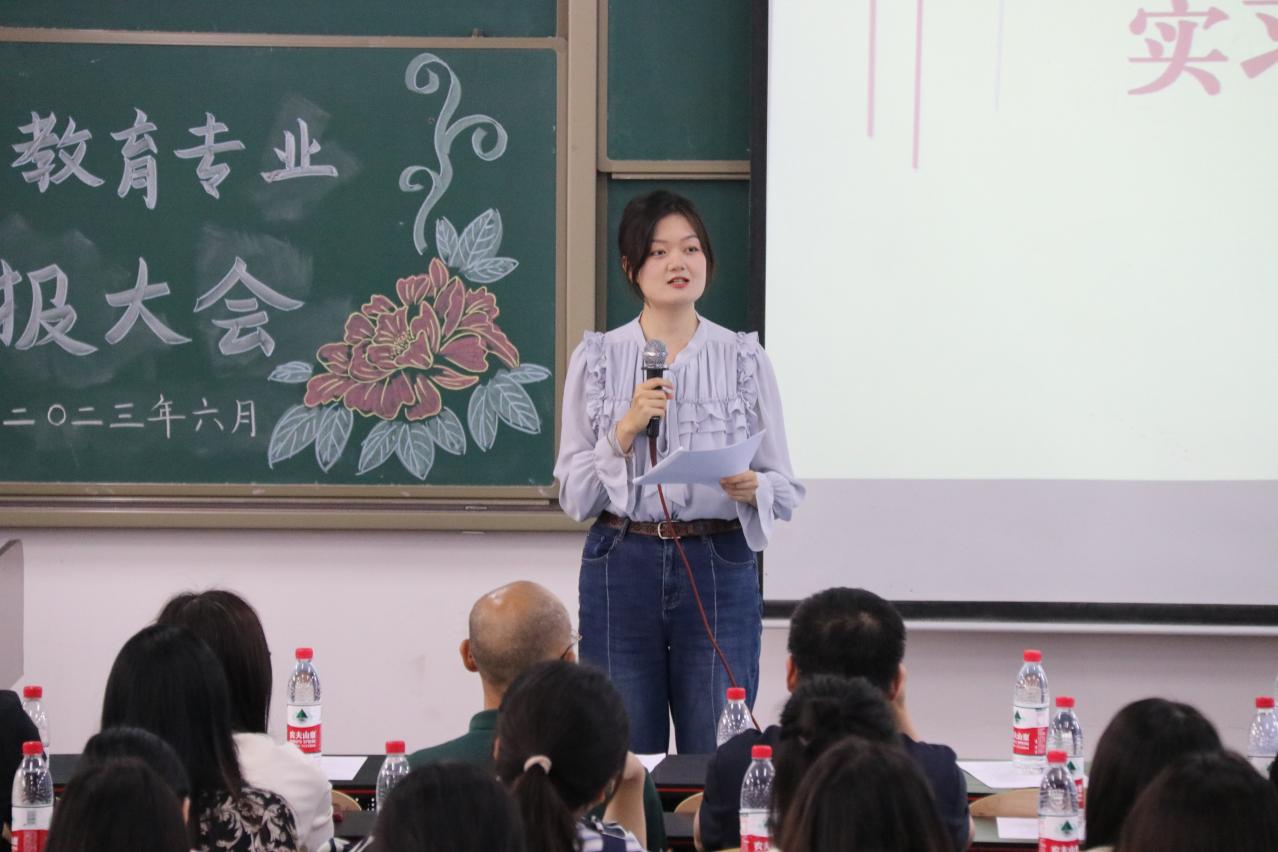 学生代表张雯琪用幽默风趣的话语向老师同学们分享了她的实习感悟,一是寓教于乐,将教学知识融入平常生活中,激发学生的学习兴趣,更好地呈现教学效果。二是发挥思想政治教育的引领作用,思政课是一门立体艺术的打造,其知识内容背后是鲜明的逻辑理念,要发挥思政课双向互促的运用价值。三是意识到教育的唤醒作用,要从孩童本身的天性出发,逐步引导其内在潜能,实现育人的目的。