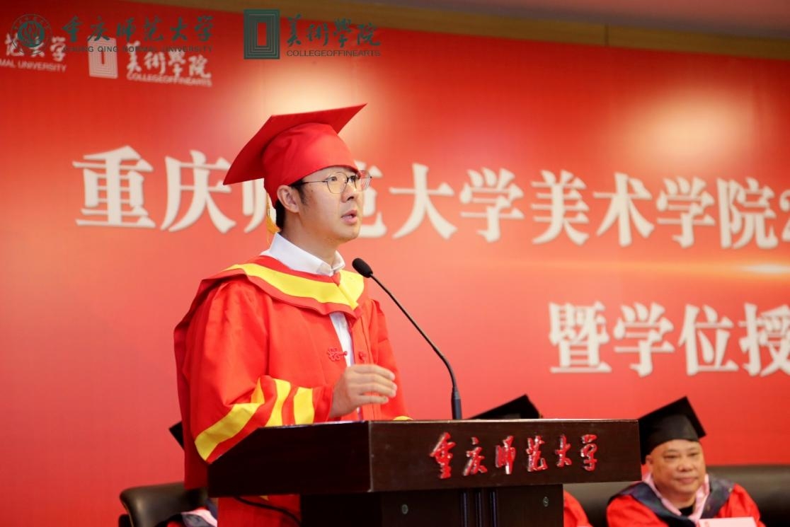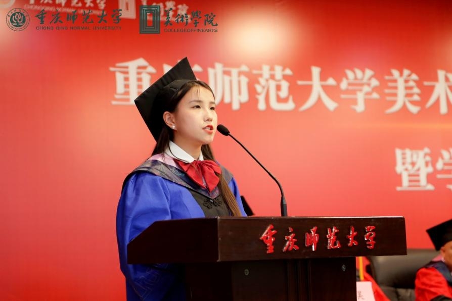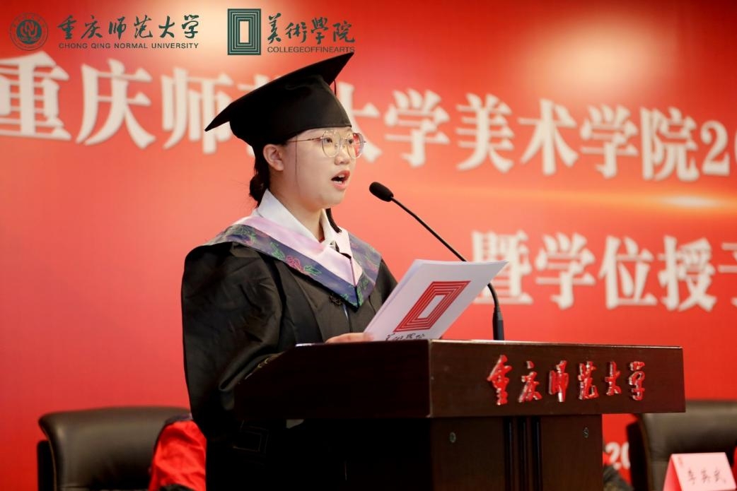 杨凯亿同学用“时间之河川流不息,每一代青年都有自己的际遇和机缘”来感慨着来自五湖四海的莘莘学子与重师相知相遇。师恩难忘,感恩老师们带领大家发现美、创造美、享受美,希望同学们在探索“人文、学术、创意、阳光、美丽”的院训中接续奋斗,追求卓越。