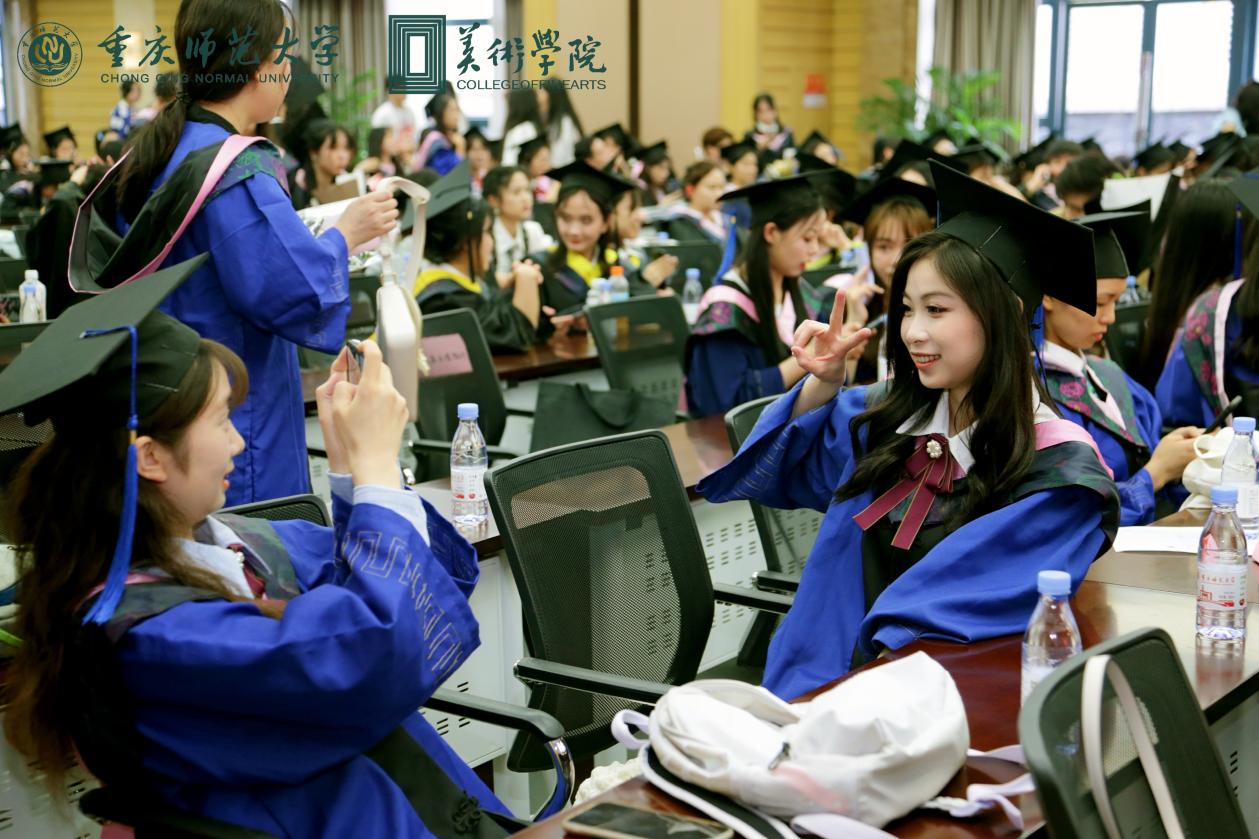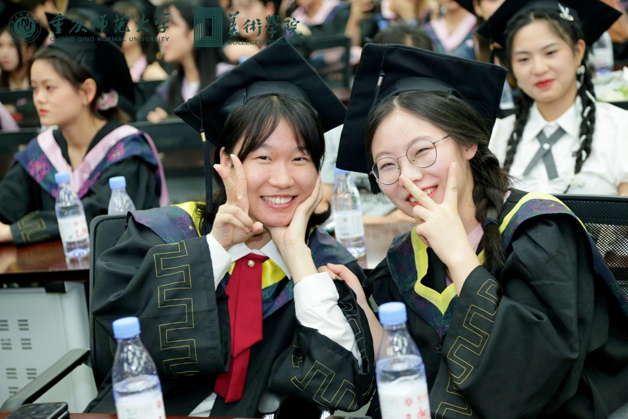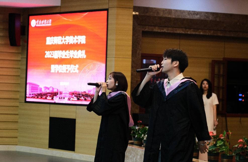 毕业典礼开始前,陈历爽和邓庆玲两位同学带来歌曲《凤凰花开的路口》《再见》。美术学院2023届毕业纪念短片《最好的我们》拉开了美术学院2023届学生毕业典礼暨学位授予仪式。