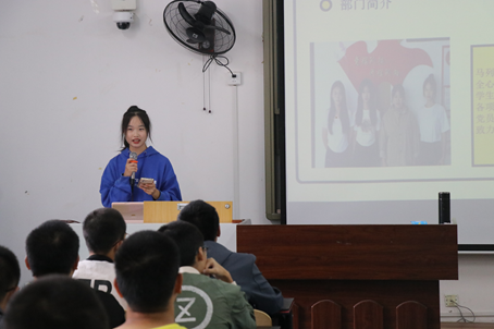 活动伊始,马列部、组织部、宣传部……等十四个团学部门依次进行宣讲。各部门宣讲人对各部门的部门职能、工作内容、团队建设、招新期待等方面进行讲解,不少部门也通过剪辑的视频来引起新生的兴趣,展示部门独特的魅力。激情洋溢的宣讲、精彩纷呈的部门、引人入胜的视频、逸趣横生的互动,宣讲人们用各自的方式让新生们体会到了团学会的活力与加入团学会后可以获得的成长与收获。我院团学会一直以服务学生为宗旨,以提高学生综合素质、促进学生全面发展为主要工作方向,不断加强自身团队建设,用热情感染同学,用责任坚持初心,充分发挥自身优势带动同学们一起更好向上。