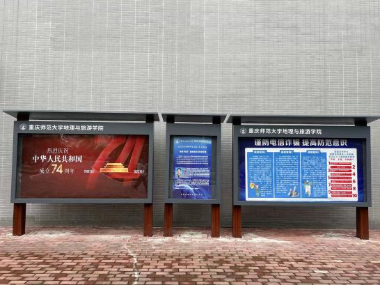 (四)重新打造升级“两横一竖”户外宣传栏,结合时事动态更新,九月以来更换学术论坛讲座海报、反诈主题宣传画和迎接新生等,更有中秋和国庆主题的宣传,充分彰显爱国主义。