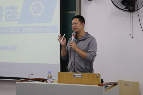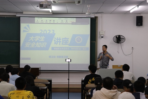 本次讲座中,李鑫副处长主要从人身安全、消防安全和财产安全三个方面为2023级新生们普及安全知识。他指出,作为大学生,遵守校规校纪不仅是应尽的责任,更是对个人品质和社会责任的体现。他详细地介绍了学校的各项规章制度,包括课堂纪律、宿舍管理、校园行为规范等,并提醒同学们要做到自律,养成良好的行为习惯。同时他强调安全教育的重要性,从人身安全的角度,提醒同学们在校园内要注意交通安全,避免发生意外。在消防安全方面,他详细介绍了如何正确使用灭火器以及如何在火灾发生时迅速逃离现场的方法,并且强调在宿舍使用违规电器的严重性和危害性。最后针对财产安全问题他强调了保护个人财物的重要性,建议同学们要时刻提高警惕,防止盗窃和诈骗事件的发生